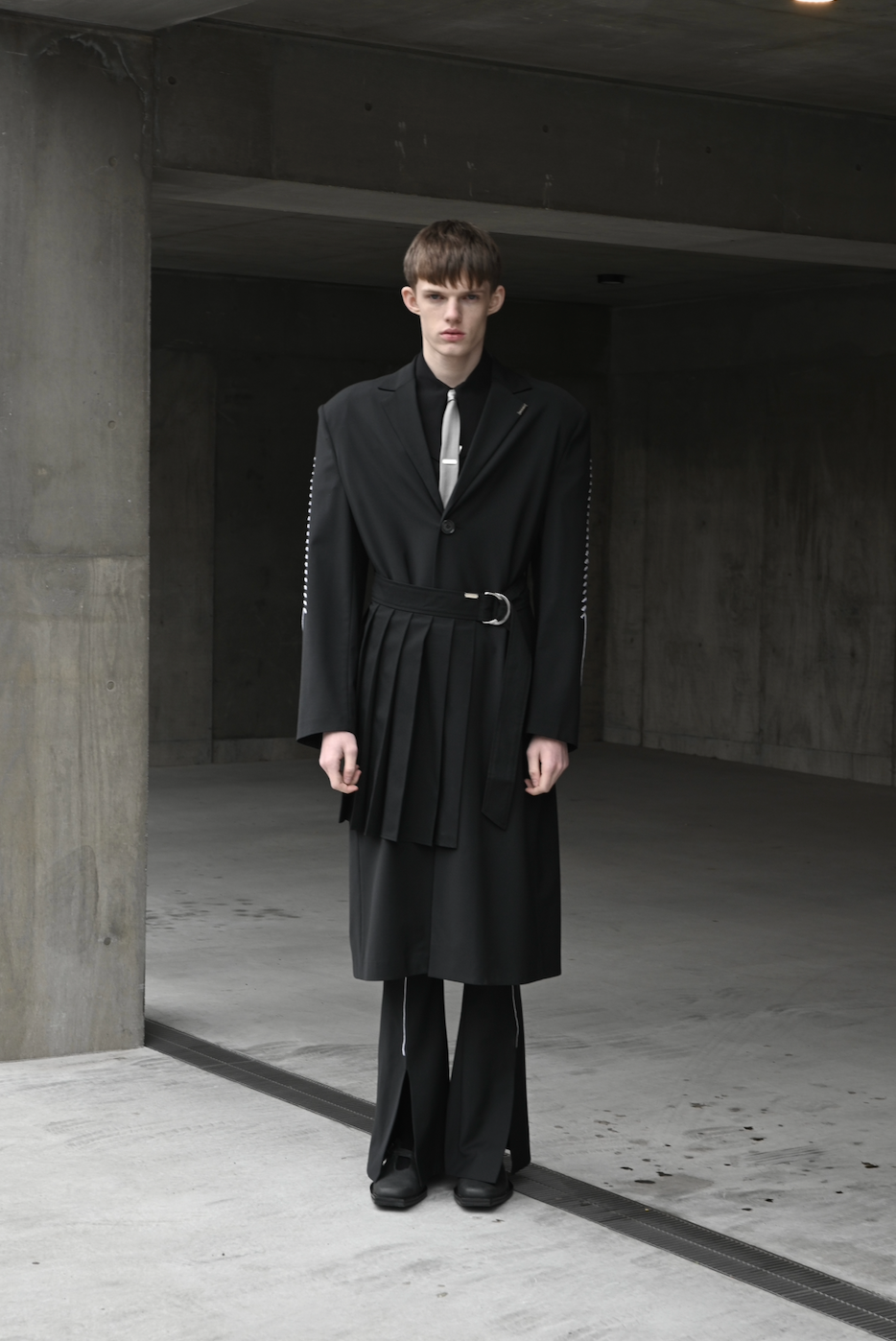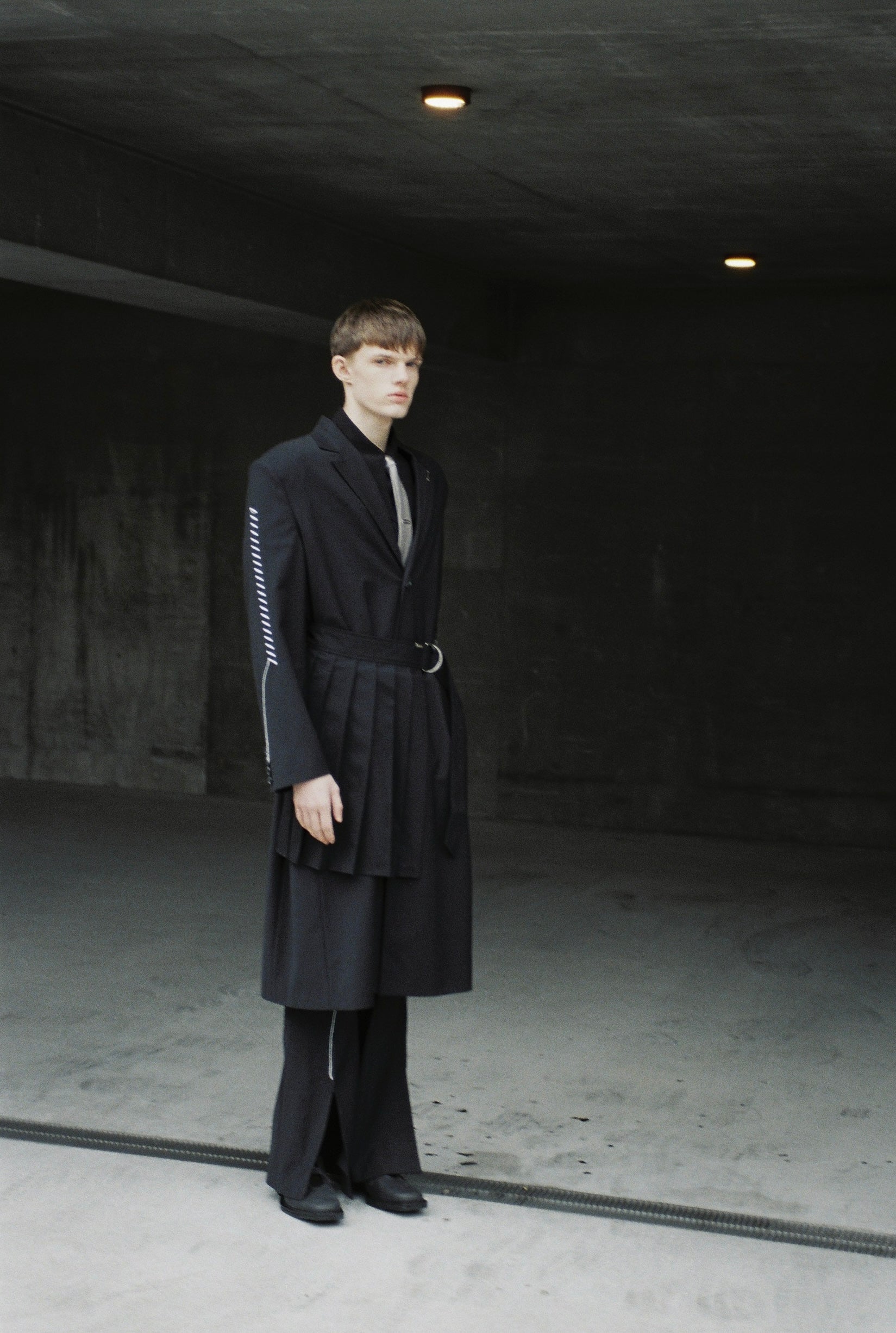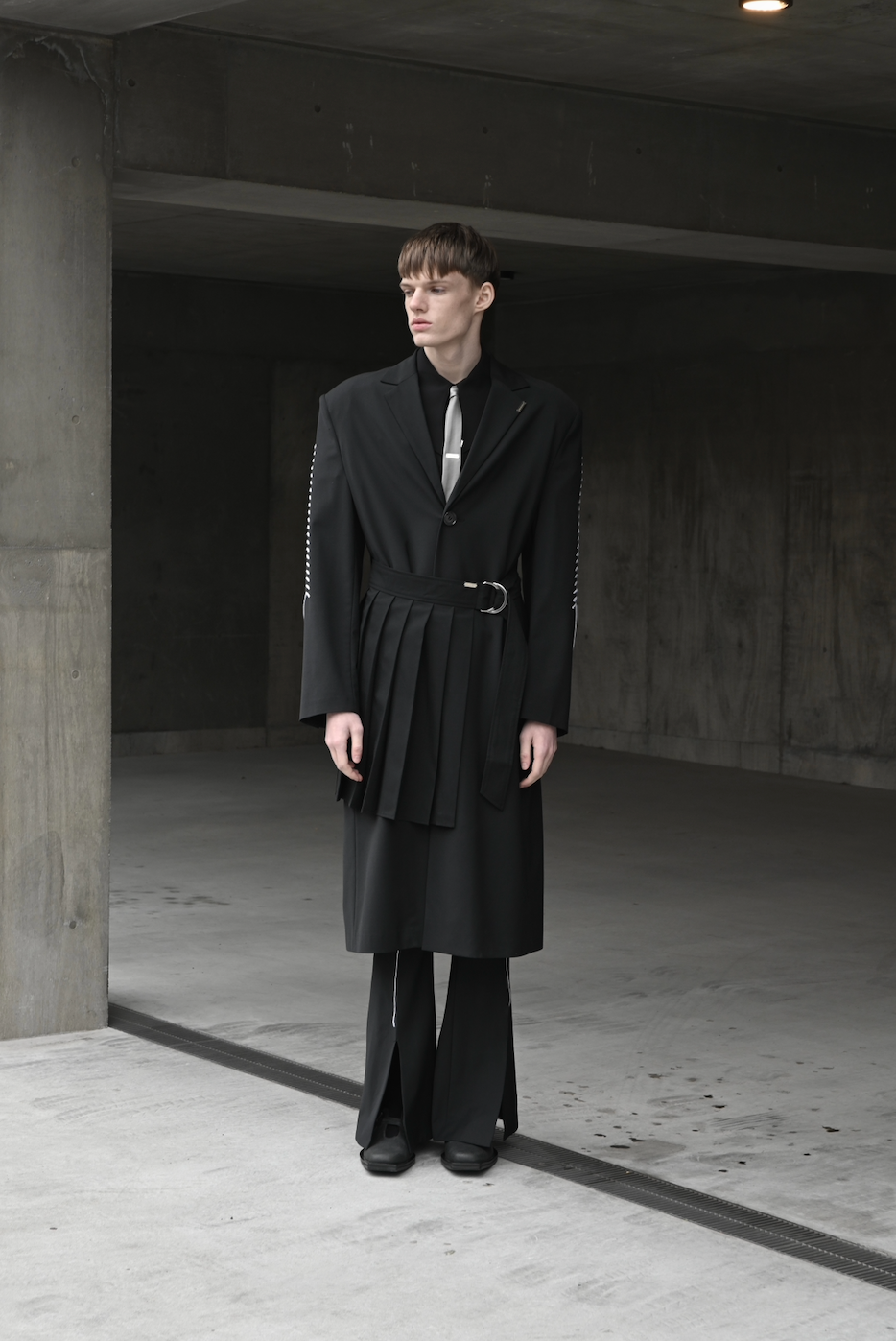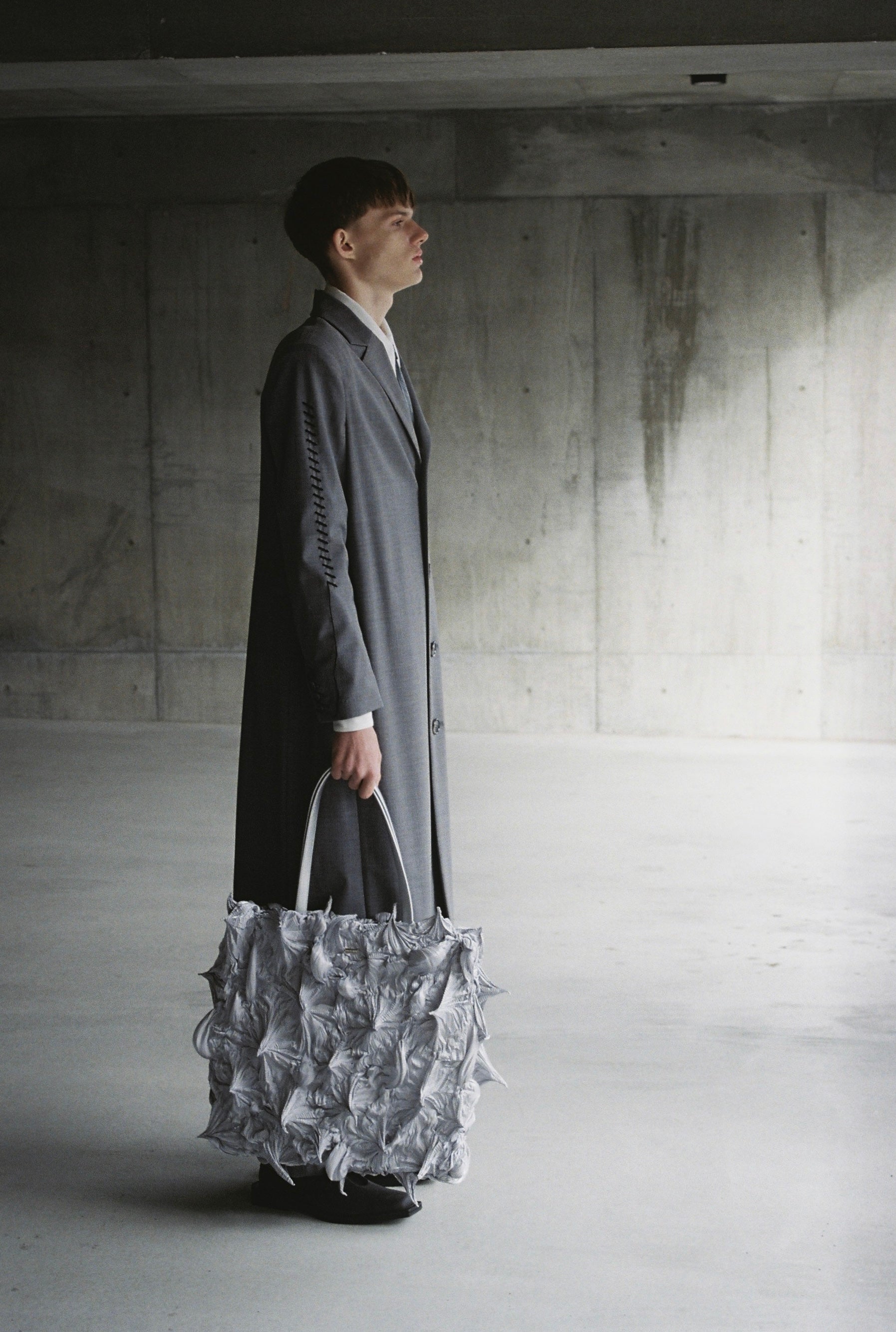 パワーショルダーのロングコートをベースに、刺繍加工とプリーツベルトを合わせました。生地にはヴァージンウールとリサイクルポリエステルをブレンドしたものを採用し、上質な艶感に加えて防シワ性が備わっています。