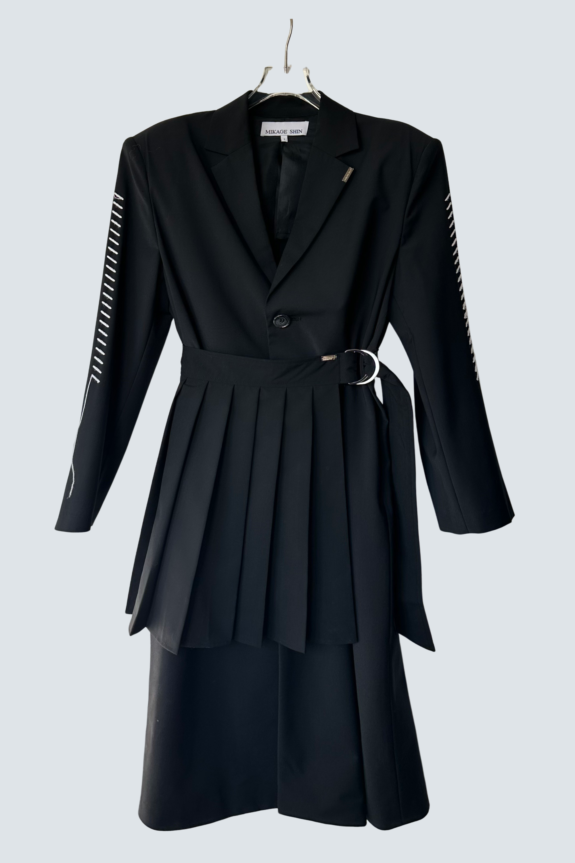 袖には、国内の刺繍職人の方とオリジナルで開発したステッチ調の刺繍を施しています。ジャケットでもシンプルになりすぎないよう、MIKAGE SHINらしい繊細かつハードなディティールを加えています。プリーツベルトは取り外して単体としてもご着用いただけます。