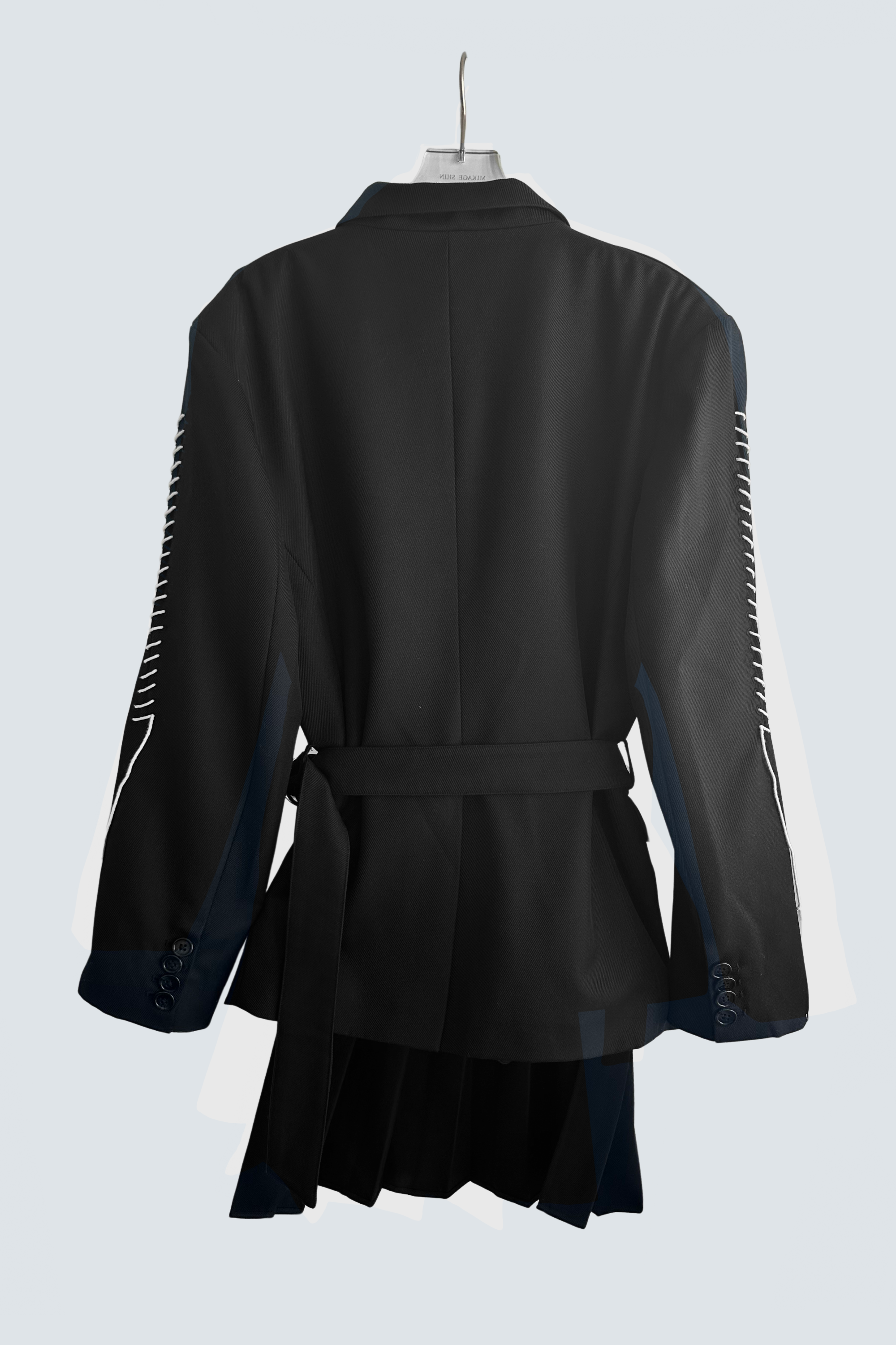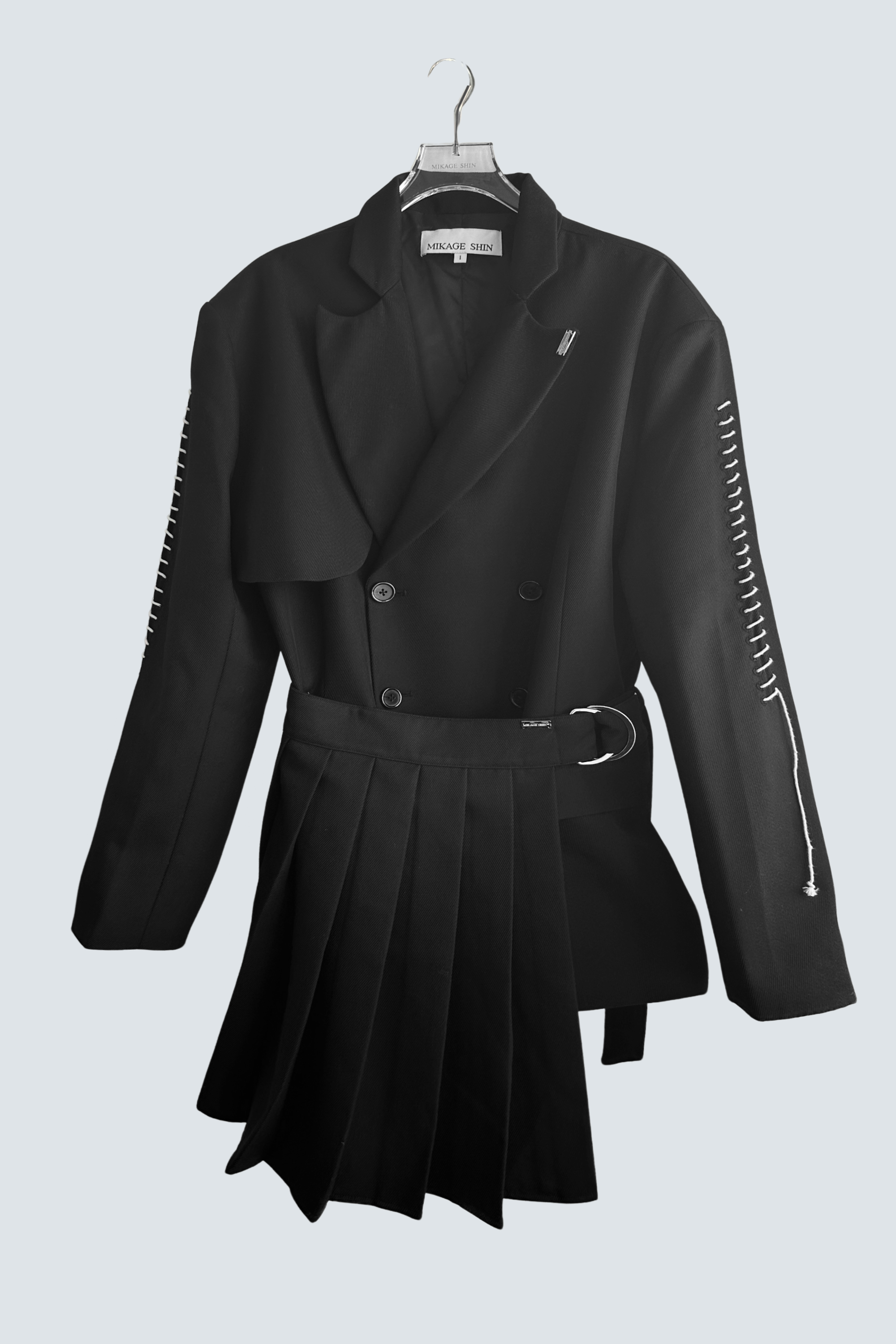 ピークドラペルのテーラードジャケットに、取り外し可能なプリーツベルトがドッキングしたテーラードジャケットです。