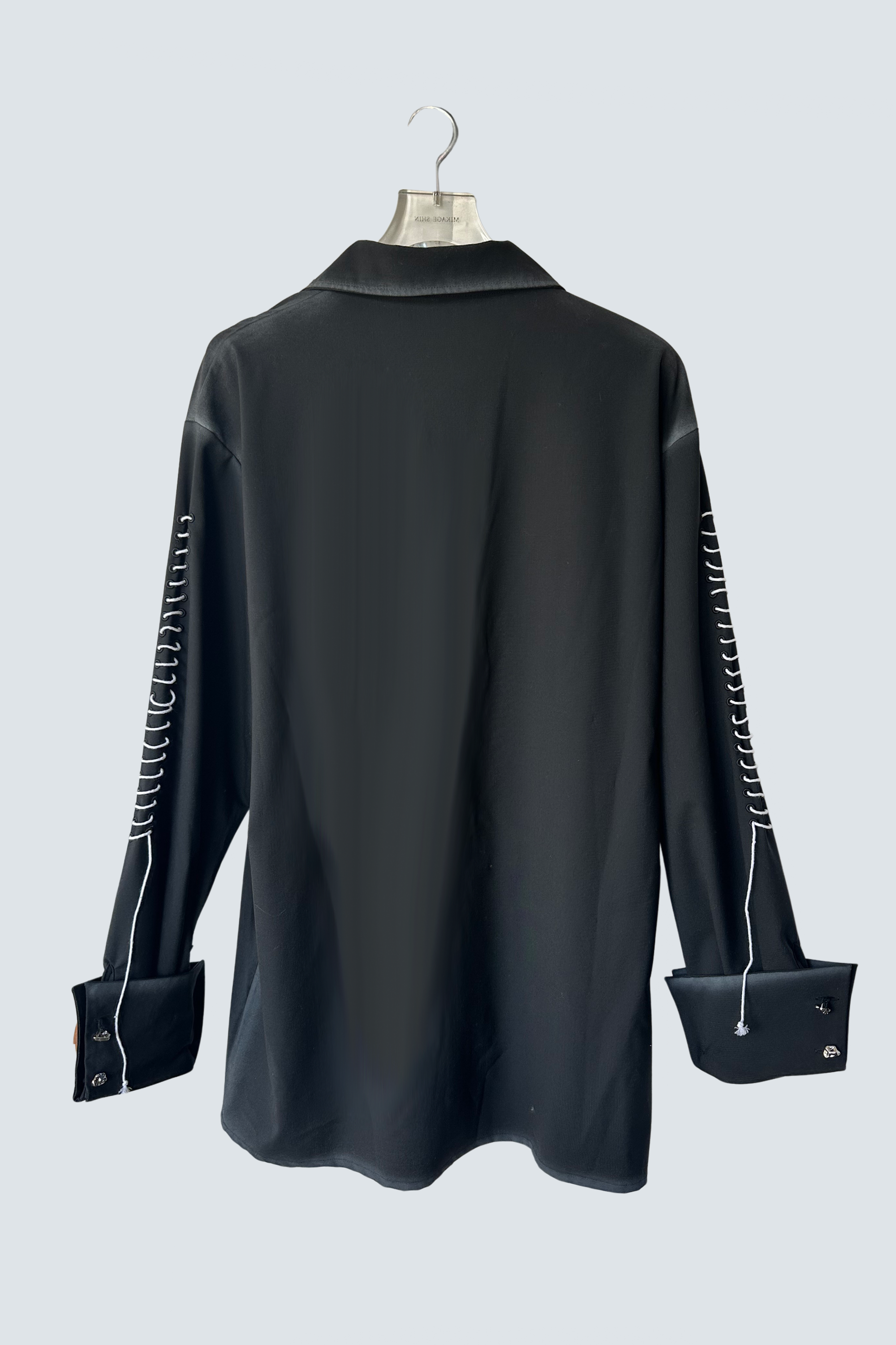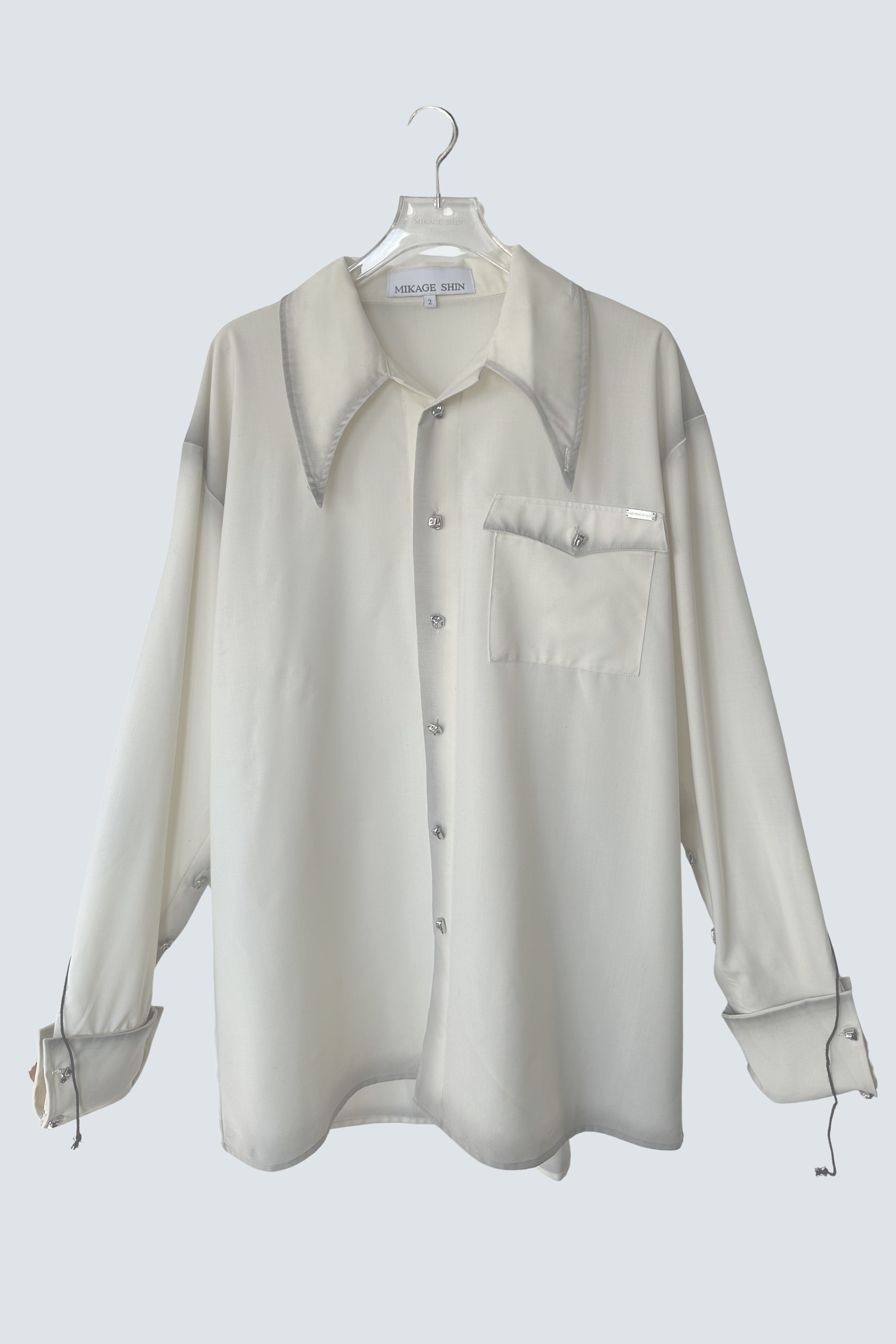 袖には、レースアップ加工を施しておりシンプルになりすぎないアクセントを付けています。袖の内側部分には脇下まで開くようにボタンをあしらい、腕を出して春夏も涼やかに着られる仕立てです。