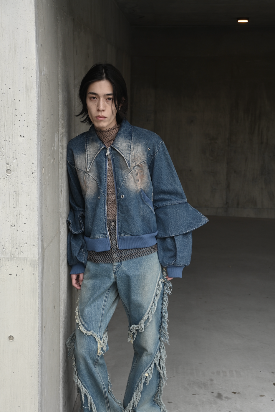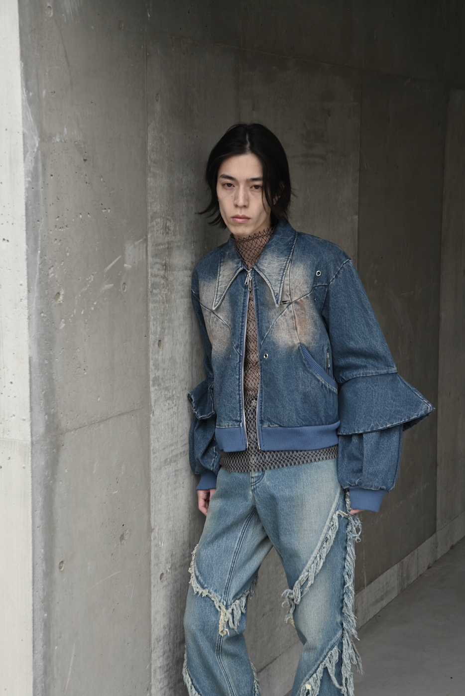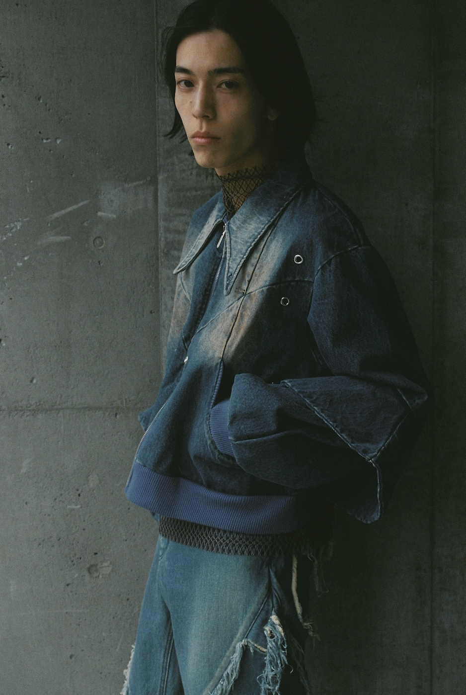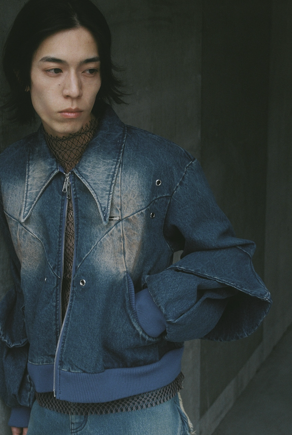 曲線的な切り替えやオイルウォッシュで、深みのある作り込みになっています。大きな襟のシャープなシルエットや、袖部分のフレアのレイヤーのアクセントで、デニムブルゾンでもカジュアルになりすぎずにモードに着られるシルエットです。